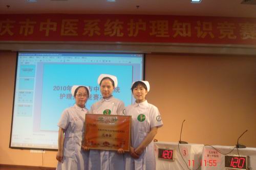 为配合卫生部2010年“优质护理服务示范工程”活动,重庆市卫生局组织了全市中医系统护理知识竞赛。县中医院于4月28日接到通知后迅速组队准备参赛。在医院和护理部领导的支持、关怀下,我队三位选手利用不到一周的时间潜心学习,在5月5日的预赛(笔试)中以团体总分第二的成绩从四十二支参赛队伍中胜出,从而拿到了进军复赛的入场券。