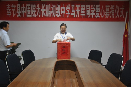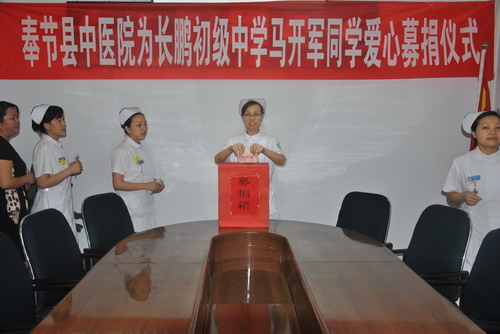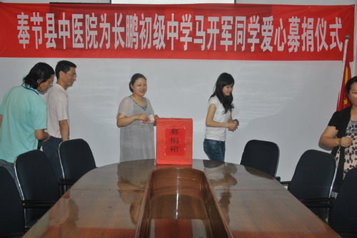 2011年6月2日,奉节县中医院领导班子、各科室代表和行后全体职工共计40余人,在医院小会议室举行了“奉节县中医院为长鹏初级中学马开军同学爱心募捐仪式”,捐款氛围踊跃,共募集善款2927元。重庆大渝网等媒体记者出席募捐仪式并记录下感人的场面。