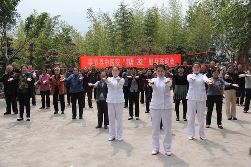 本报讯 “一二三四五六七八,二二三四五六七八……”伴随着轻快的音乐,踩着准确的节奏,在医院健身专家的带领下,69名“糖友”翩翩起舞。4月11日,奉节县中医院组织第3次“糖尿病之家”联谊会。会上,医院向“糖友”教授了一套健身操。“这是我们治疗糖尿病的具体举措之一!”活动现场,该医院副院长杨晓云说,近年来,他们对糖尿病患者大力开展运动疗法,先后使众多“糖友”重拾了笑容。