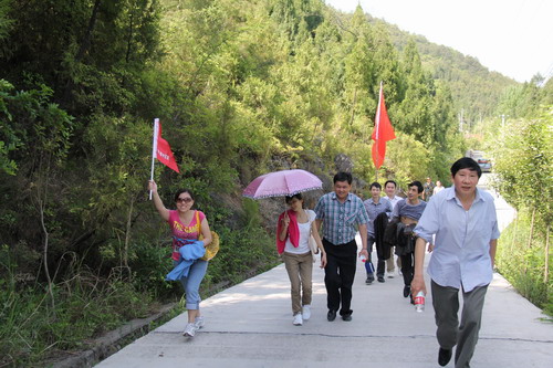 上午9点,所有参加人员共9支分队在领队的组织带领下,拉开活动序幕。按活动路线(县城→长江大桥左转→大风垭永乐镇丰收村卫生室下车→沿支路步行寻“宝物”→文峰塔又名乌云顶),所有登山人员活力与激情并存,尽管骄阳似火,但热情更是一潮又一潮,不比骄阳逊色。按工作人员贴的箭头标识沿途约2小时的登山徒步,各分队充分发挥了团结协作的精神,所向披靡,有激动有尖叫有帮扶有赶超,但都玩得不亦乐乎,异常精彩。100多人的庞大登山队伍,一路欢笑与激情气氛笼罩着整座大山。名列前茅的登山队员还寻到神秘“宝物”一份,充分洋溢诠释了活动的趣味性。