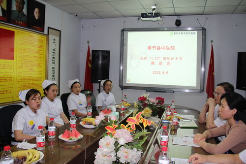 为纪念5•12国际护士节和《护士条例》实施5周年,全面推进优质护理服务工作,营造尊重爱护护士、重视支持护理的良好氛围,5月9日下午3点,奉节县中医院召开庆祝2013年“5.12”国际护士节座谈会。医院党总支书记、院长史克祥,分管副院长杨晓云、副院长陈孔建及来自临床科室的护士代表共计40余人参加了座谈,会议由护理部主任金胜琼主持。