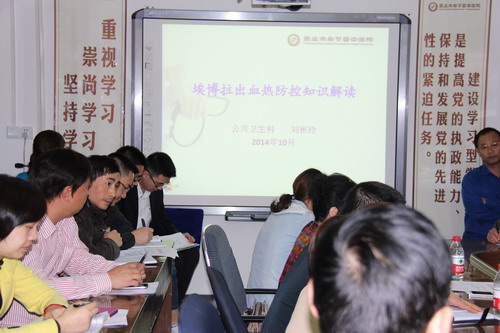 培训会上,分管领导杨晓云副院长强调了做好疫情防控准备工作的重要性,并要求各临床科室做好本科室医务人员的二次培训、预检分诊等工作。公共卫生科刘彬玲科长对国家卫生计生委制定的《埃博拉出血热防控方案》进行了解读,并对埃博拉出血热的院感防护措施进行了详细讲解。