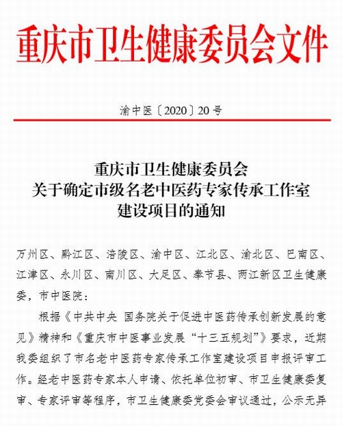 为加强中医药继承与创新,进一步做好名老中医药专家学术经验传承工作,培养中医药人才,探索建立中医药学术传承及推广应用的有效方法和创新模式,市卫生健康委员会开展了重庆市名老中医药专家传承工作室建设项目。