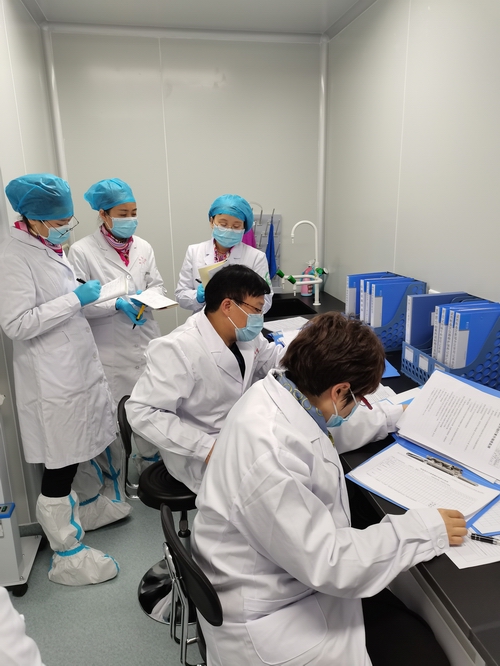专家组现场查看了核酸实验室的区域设置、仪器设备配置、人员资质、样本管理、检测方法等。通过仔细检查,专家组对医院实验室布局、设备、人才建设等方面提出建设性意见,充分肯定了核酸实验室的建设工作,认为硬件、软件均能够满足新冠病毒检测要求,达到国家核酸实验室P2标准,同意通过验收。