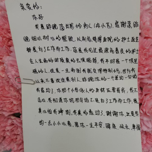 当日,这位患者“姐姐”特意委托快递小哥送来了锦旗、鲜花、感谢信。并且在信中多次感谢出诊护士小罗细心和耐心的照顾,还在信中写道因为出诊护士的工作态度及人文服务护理改变了她对医院医生、护士的新认识,曾经的她认为医院的医生、护士只是为了工作而工作,本次因为出诊护士待患如亲,一句句真诚的关心、一句句贴心的问候,让她感受到了爱是黑夜里最亮的光。