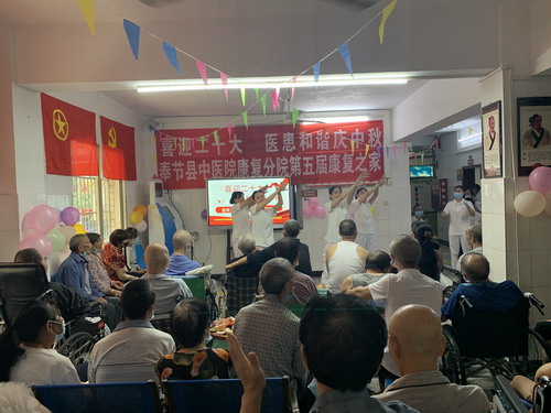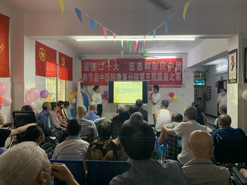 在“中国共产党第二十次全国代表大会”及“中秋节”来临之际,9月9日下午,奉节县中医院康复分院开展“喜迎二十大 医患和谐庆中秋”暨第五届“康复之家”医患联谊活动,全体医护人员、住院患者和患者家属共计90余人参加活动。