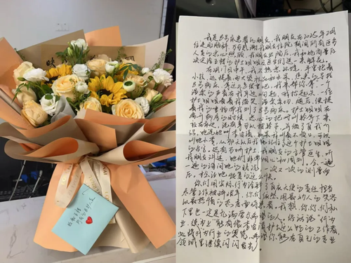 “这是出院患者,为表达感谢特意送来的鲜花”。夜幕降临,一位快递小哥把一束鲜花和一封书信放在奉节县中医院5楼护士站。