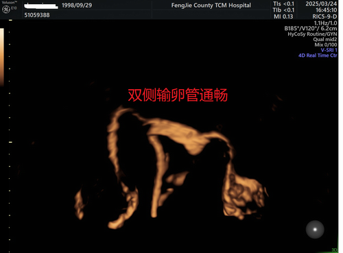 患者小鲜(化名),因婚后未避孕未孕1年余,诊断原发不孕,经涂晓娟支医专家全面评估后,行子宫输卵管超声造影检查,宫腔内见造影剂充盈呈倒三角形,无膨隆,双侧输卵管全程显影,走行自然柔顺,粗细均匀,无明显扭曲,双侧伞端可见造影剂呈均匀片状溢出,诊断为双侧输卵管通畅,解除了小鲜长期以来对输卵管是否通畅的疑惑。