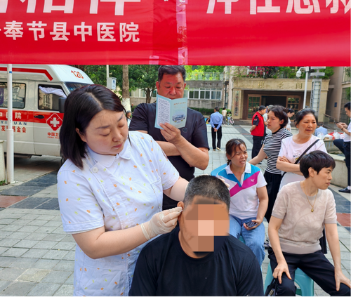 在急救知识培训环节,急诊科的主任孔祥洲亲自带队,现场为居民开展心肺复苏急救技能培训,详细讲解了心肺复苏(CPR)的重要意义与规范操作流程。同时护士长王杰则邀请了一位高血压患者,演示耳尖放血疗法。演示过程中,王杰护士长结合实际操作,生动阐述了耳尖放血疗法在缓解高血压、偏头痛、失眠焦虑等症状方面的显著功效,赢得现场群众的广泛认可。