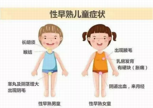 食品安全问题,不良的生活习惯导致儿童性早熟明显增加。女生乳房早发育,甚至月经初潮年龄明显提前;男生喉结突出,变声,性早熟会使青春期提前到来,从而导致骨骺线过早闭合,最终导致身材矮小。