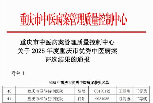 近日,重庆市中医病案管理质量控制中心公布了2025年度重庆市优秀中医病案评选结果。奉节县中医院妇产科医师王亚明住院病案、心血管病科医师袁海燕门诊病案在此次评选中荣获三等奖。
