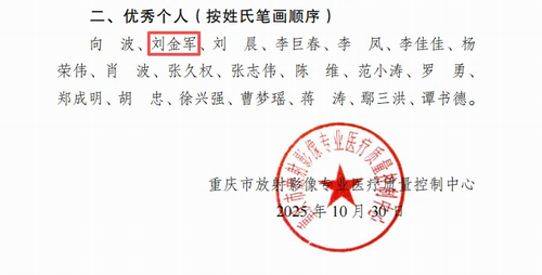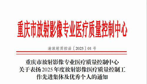 近日,重庆市放射影像专业医疗质量控制中心正式发布《关于表扬2025年度放射影像医疗质量控制工作先进集体及优秀个人的通知》(渝放射质控〔2025〕1号)。经中心专家组严格评审,奉节县中医院影像科主任刘金军凭借其在放射影像质量控制、医共体建设、放射技术推广及学科建设等方面的突出表现,荣获“2025年度重庆市放射影像医疗质量控制工作优秀个人” 荣誉称号。