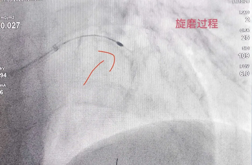 术中,团队先后3次使用1.5万转/分的旋磨头,精准击碎钙化"硬壳"。旋磨成功后,顺利行球囊扩张并于前降支植入支架。同期,团队还对右冠病变进行了介入处理。术后患者血管开通效果理想,目前正在康复中。